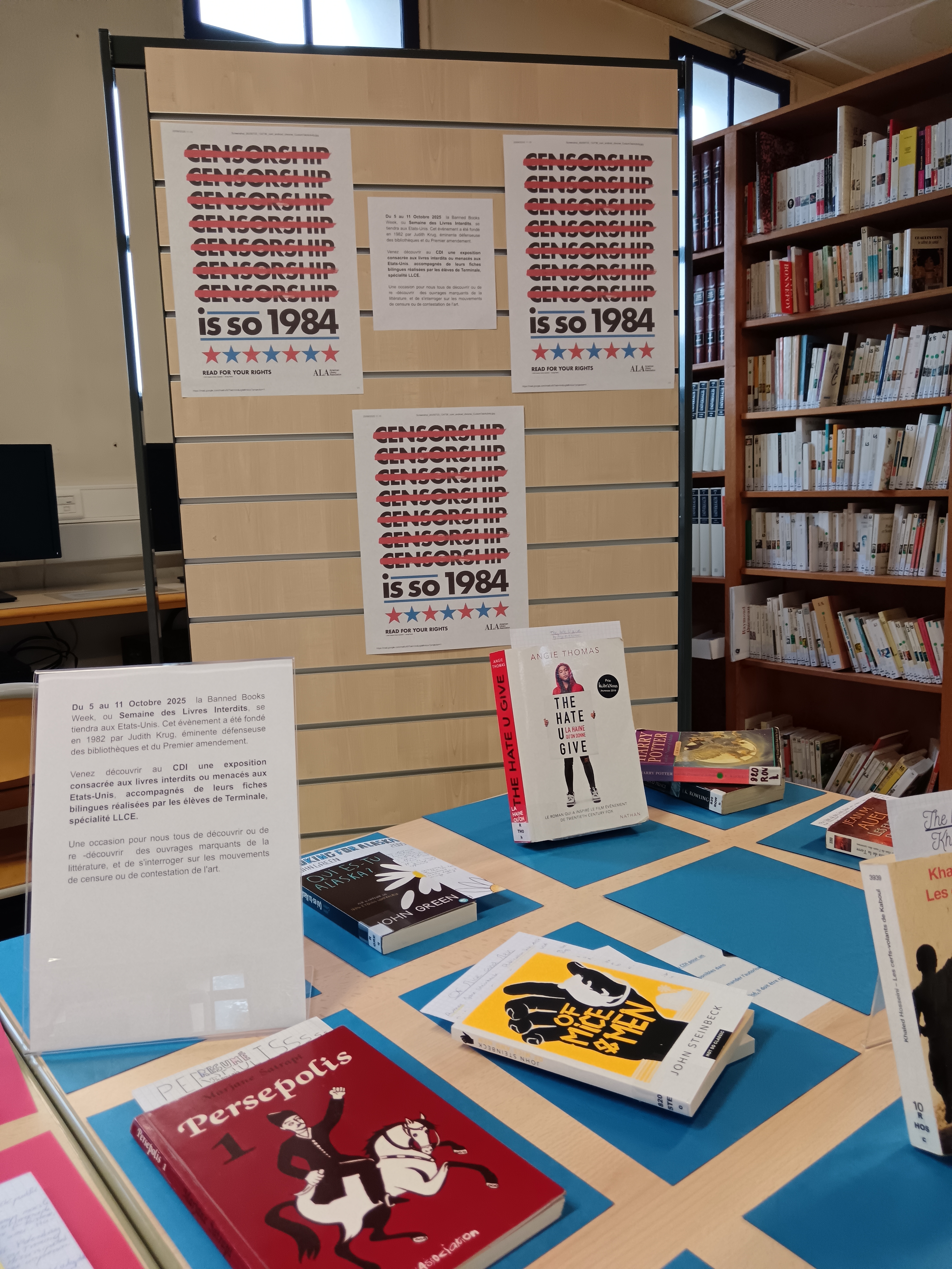 A cette occasion, chacun d'entre nous pourra aller découvrir au CDI une exposition consacrée aux livres interdits ou menacés aux Etats-Unis, accompagnés de leurs fiches bilingues réalisées par les élèves de Terminale, spécialité LLCE.