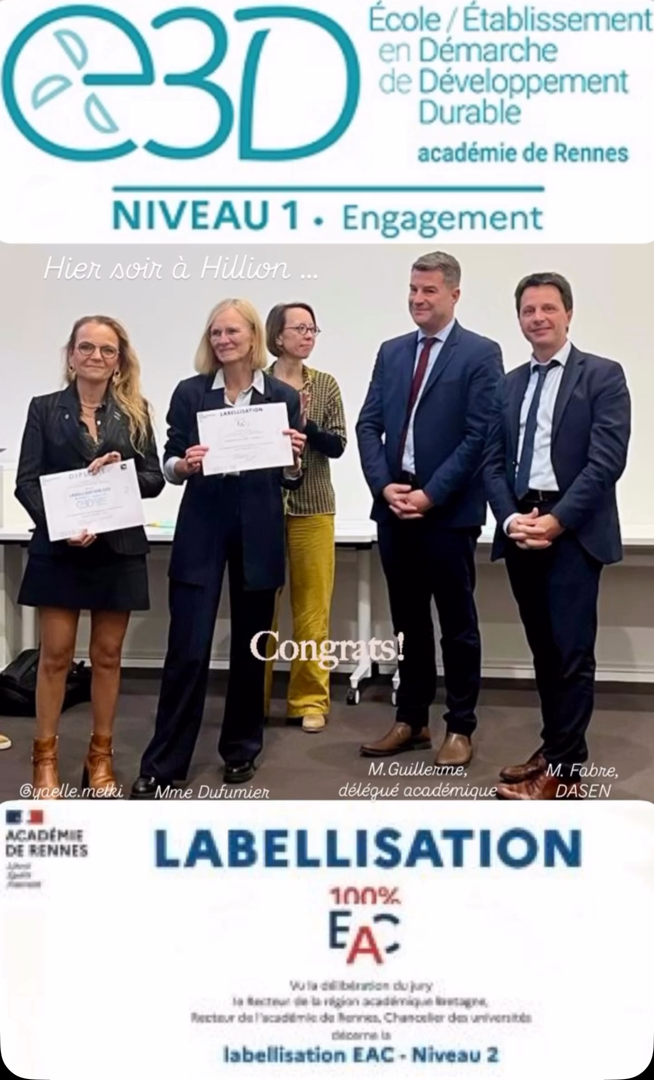 Ce lundi 13 Octobre, le lycée Ernest Renan recevait le Label E3D niveau 1 et le Label EAC niveau 2 pour une durée de 3 ans. La cérémonie de remise des labels a eu lieu lundi soir au collège d’Hillion en présence de M. Fabre DASEN 22 et de M. Guillerme, Délégué Académique à l’EAC et l’EDD.